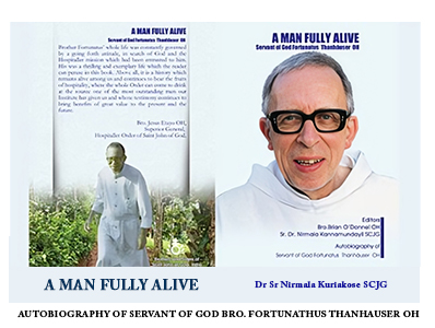 A Man Fully Alive, is an outline of the life of Servant of God Brother Fortunatus Thanhäuser. The Original of this book is in German language as Erinnerungen an ein erfÜlltes Leben published in 2007 by Johann von Gott Verlag, MÜnchen. English translation prepared by brother Alfons Maria HÖring OH. Bro. Brian O’ Donnell OH and Sr. Nirmala Kannamundayil SCJG are the editors of this book. Available at: Brothers and Sisters of St. John of God Kattappana.